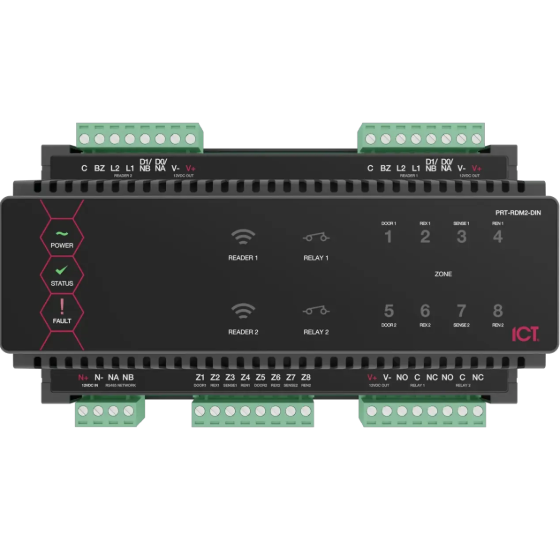 Designed for industry-standard DIN rail mounting, the Protege DIN Rail 2 Door Reader Expander also supports intelligent tamper monitoring and offline functions, including No Users, All Users, and First 10 Users modes, with a 150 card cache. It offers over 40 predefined reading formats and allows control of up to three outputs per reader port, providing a comprehensive solution for access control and security management.