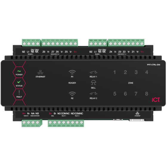 A compact, scalable controller providing integrated access control and alarm management. Supports two onboard readers (Wiegand or RS-485), connects to all Protege expansion modules, and integrates with the PRT-GX-SRVR Protege GX Management Suite. Scalable to 64 doors with unlimited users and access levels. Features two Form C lock outputs, eight zone inputs, full peer-to-peer communication, and Ethernet-based firmware upgrades. Compatible with all existing SE modules and devices. Operates on 12 VDC. No onboard PSTN dialer.