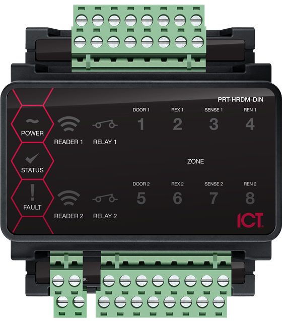 Key features include two reader ports, independently configurable for Wiegand or RS-485 operation, and support for OSDP-configurable RS-485. It also offers a fused and monitored reader power supply, ensuring reliable performance. Designed for easy installation with industry-standard DIN rail mounting, the expander supports intelligent tamper operation and includes offline functions like No Users, All Users, and First 10 Users plus 150 Card Cache. With over 40 predefined reading formats and the ability to control up to three outputs per reader port, the Protege Half DIN Rail 2 Door Reader Expander is a robust solution for comprehensive access control management.