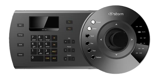 Présentation du Clavier Réseau et Contrôle pour les Caméras PTZ de STORM, un outil sophistiqué conçu pour améliorer les fonctions de manipulation et de gestion des caméras PTZ. Ce dispositif est équipé d'un joystick tridimensionnel permettant une manipulation précise et intuitive des fonctions de panoramique, d'inclinaison et de zoom.